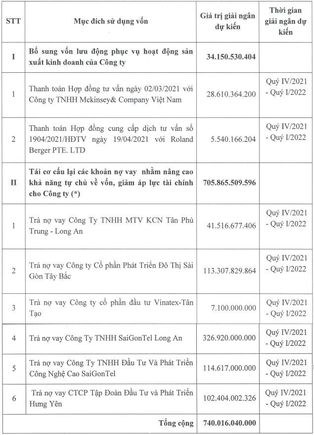 Trong đó, hơn 34 tỷ đồng sẽ được Saigontel sử dụng để thanh toán 2 hợp đồng tư vấn, còn lại gần 706 tỷ đồng sử dụng để tái cơ cấu các khoản nợ vay nhằm nâng cao khả năng tự chủ về vốn, giảm áp lực tài chính cho Công ty.