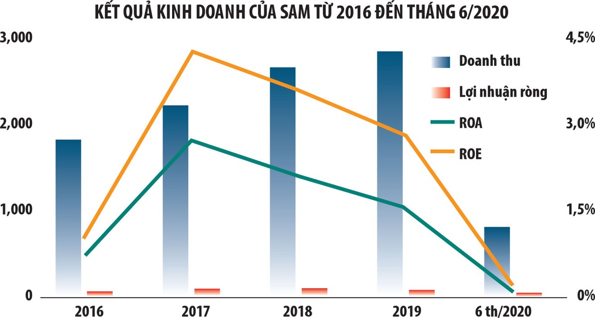 Năm 2020, trong 6 tháng đầu năm, SAM Holdings ghi nhận doanh thu 806,2 tỷ đồng, lợi nhuận sau thuế 7,5 tỷ đồng, lần lượt giảm 31,2% và 55,4% so với cùng kỳ, hoàn thành 17% kế hoạch lợi nhuận trước thuế cả năm. Biên lợi nhuận gộp giảm 9,6%, về còn 5,1% và biên lợi nhuận ròng giảm từ 1,4% về 0,9%.