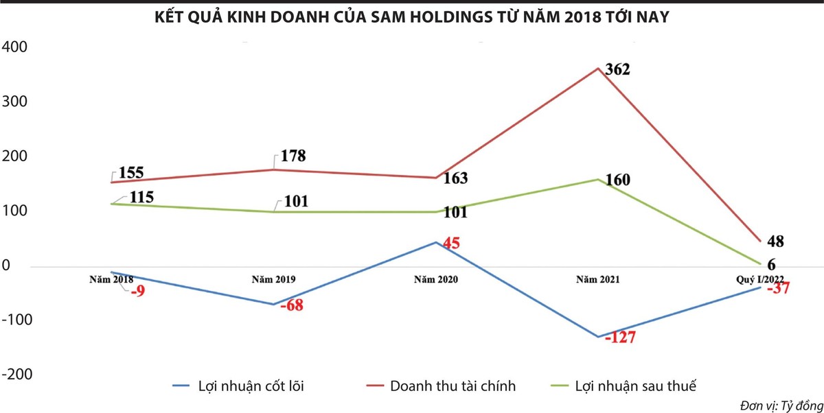 Trong nhiều năm trở lại đây, SAM Holdings chỉ thoát lỗ nhờ vào hoạt động đầu tư tài chính. Ngược lại, hoạt động kinh doanh cốt lõi (lợi nhuận gộp trừ chi phí tài chính, chi phí bán hàng và quản lý doanh nghiệp) liên tục suy giảm, thậm chí lỗ kéo dài.