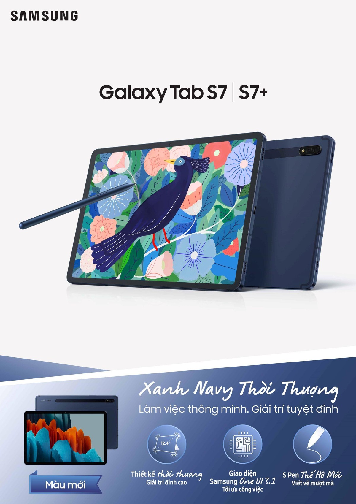Bộ đôi Galaxy Tab S7 và S7+ là dòng máy tính bảng cao cấp sở hữu thiết kế mỏng, nhẹ nay còn được kết hợp cùng công nghệ phối màu tinh xảo, càng khiến cho phiên bản màu sắc xanh navy mới trở nên lịch lãm hơn.