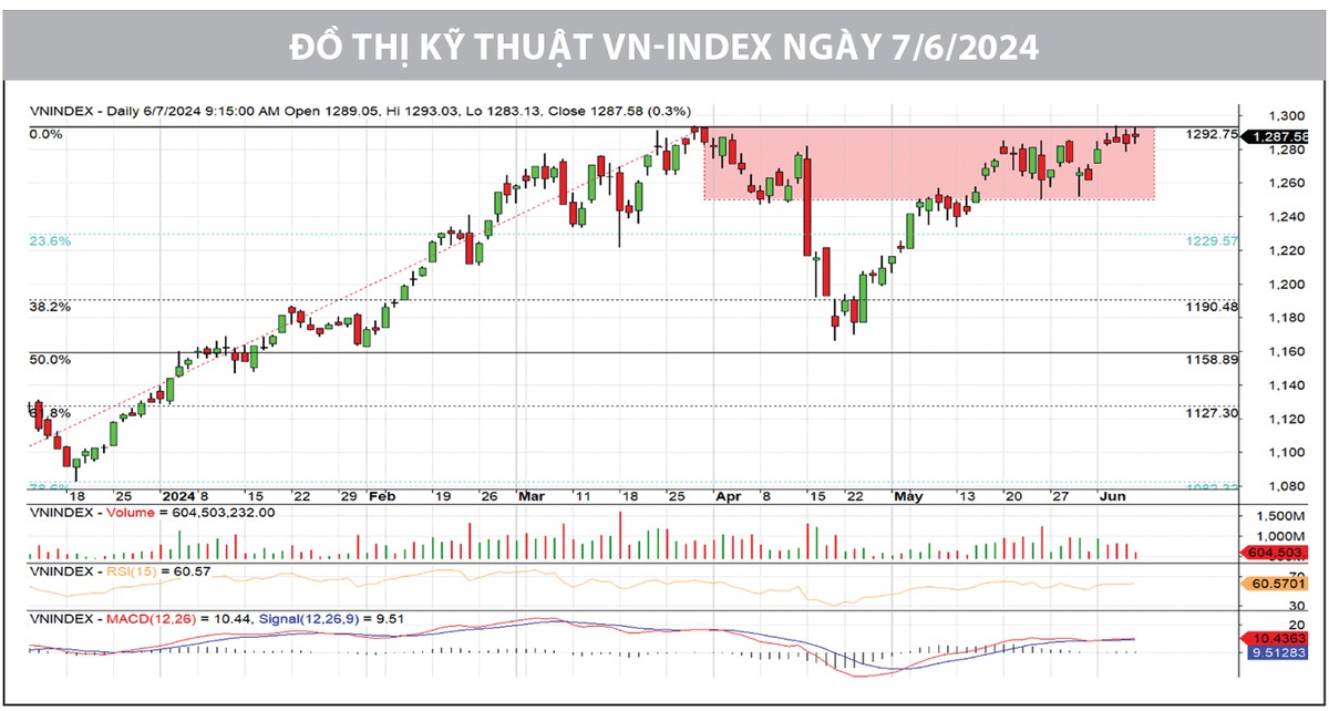 VN-Index tiếp tục diễn biến giằng co trong tuần qua khi chỉ số có điều kiện tiệm cận vùng kháng cự 1.290 - 1.300 điểm trong 4 phiên giao dịch gần nhất. Dù chưa có sự bứt phá mới nhưng vẫn ghi nhận một tuần tăng điểm và trạng thái vận động của thị trường trong tuần qua được củng cố bởi tâm lý giao dịch ổn định dần trước các chuyển biến “dễ thở” hơn từ các yếu tố vĩ mô. Điển hình như dữ liệu kinh tế vĩ mô tháng 5 và 5 tháng đầu năm 2024 tiếp tục ghi nhận có nhiều cải thiện tích cực và tiếp tục củng cố cho triển vọng hồi phục.