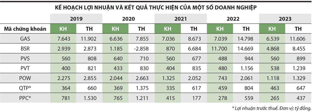Xét thời gian dài hơn, trong giai đoạn 5 năm gần đây (2019 - 2023), các doanh nghiệp trên có “truyền thống” đặt kế hoạch kinh doanh thận trọng và kết quả thực hiện vượt xa mục tiêu ban đầu (xem bảng), ngoại trừ BSR và PPC.