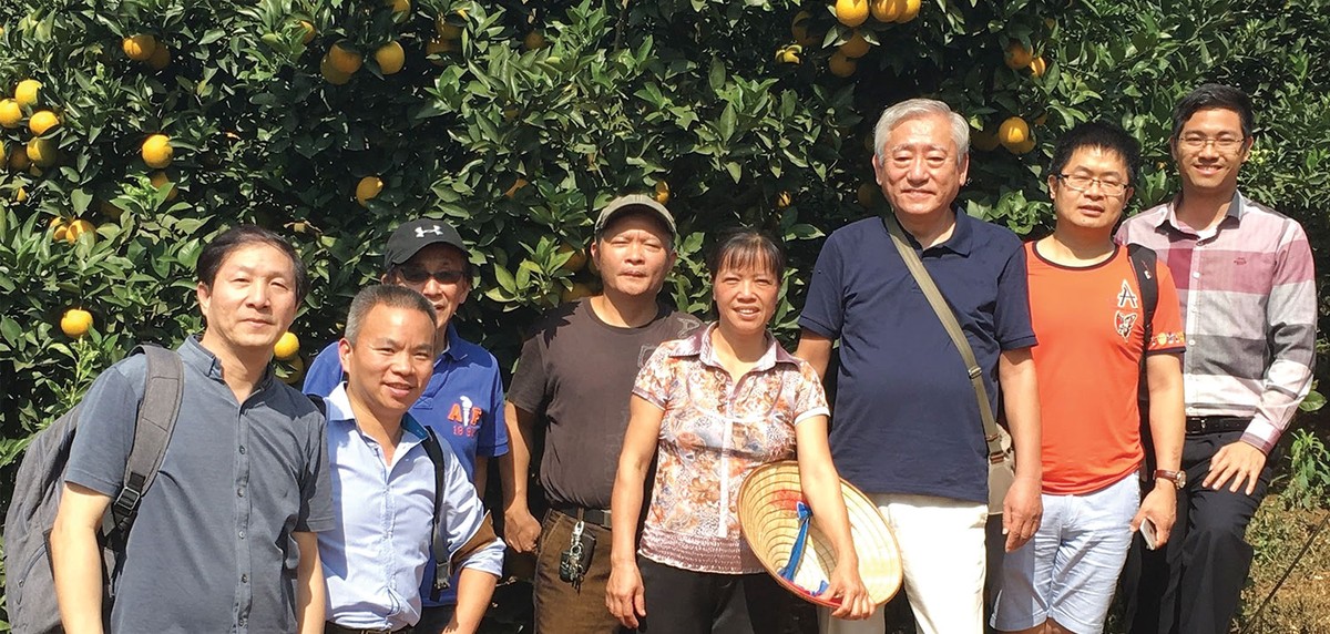 Các chuyên gia Nhật Bản làm việc cùng cán bộ SJF và bà con nông dân tại vườn cam Cao Phong, trồng theo công nghệ sạch của Nhật
