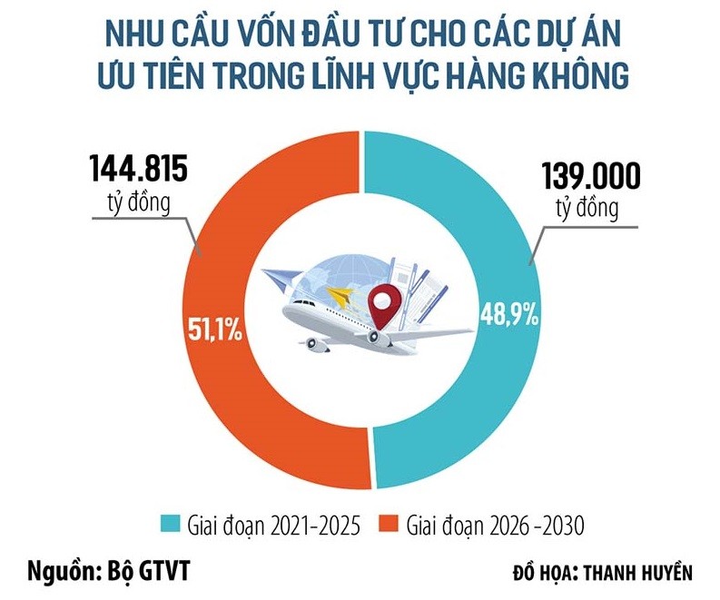 Theo tính toán sơ bộ của Bộ GTVT, để thực hiện Quy hoạch, tổng nhu cầu vốn đầu tư kết cấu hạ tầng cảng hàng không (không gồm các công trình do Tổng công ty Quản lý bay Việt Nam tự cân đối đầu tư) trong giai đoạn 2021- 2030 ước khoảng 420.472 tỷ đồng.