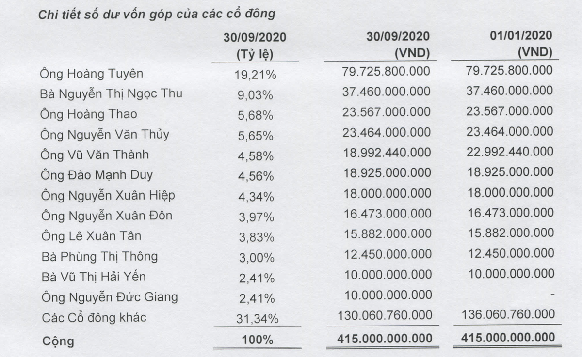 Cơ cấu cổ của TNH chỉ có 4 cổ đông lớn, gồm ông Hoàng Tuyên, Chủ tịch HDQT sở hữu 19,21%, 2 thành viên HĐQT khác là bà Nguyễn Thị Ngọc Thu 9,03% và ông Nguyễn Văn Thuỷ 5,65%. Ngoài ra, cổ đông nội bộ, cổ đông có liên quan HDQT là ông Hoàng Thao 5,68%, ông Lê Xuân Tân - Thành viên HĐQT kiêm Tổng giám đốc sở hữu 3,83% vốn.