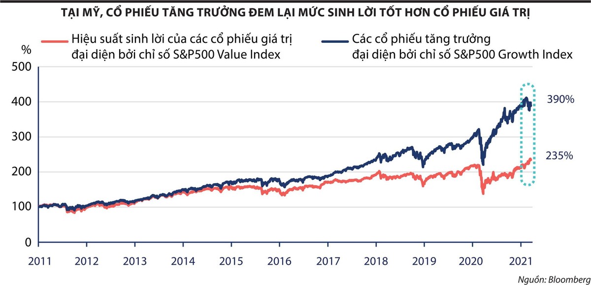 Các nhà đầu tư có xu hướng tìm kiếm lợi nhuận ở các cổ phiếu tăng trưởng hơn là tập trung danh mục vào các cổ phiếu giá trị. Tại Việt Nam, triển vọng tăng trưởng vẫn tích cực trong năm nay và một số năm tới.