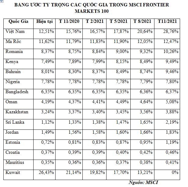 Trong tuần trước sau khi MSCI công bố lộ trình nâng hạng của Kuwait, cũng như Việt Nam sẽ là thị trường có tỷ trọng cao nhất trong nhóm các quốc gia cận biên, điều này có thể là đúng với kỳ vọng của giới đầu tư trước đó khi MSCI đã trì hoãn nâng hạng cho thị trường Kuwait từ tháng 5 sang tháng 11.