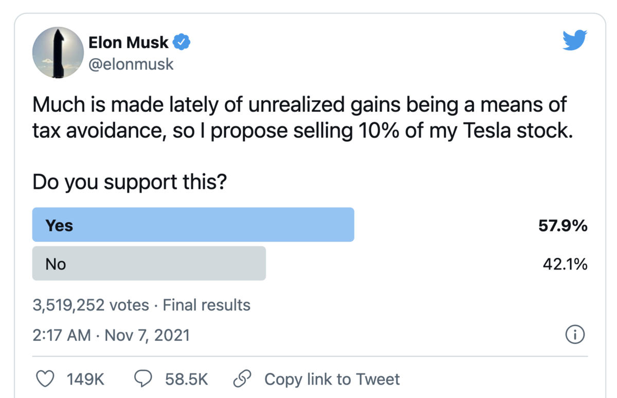 Trước khi bán ra tổng cộng gần 5 tỷ USD cổ phiếu Tesla, cuối tuần trước, Musk đã yêu cầu 62,5 triệu người theo dõi mình trên trang Twitter cá nhân bỏ phiếu trong một cuộc thăm dò không chính thức và tuyên bố lá phiếu của họ sẽ quyết định tương lai số cổ phần Tesla của vị CEO.