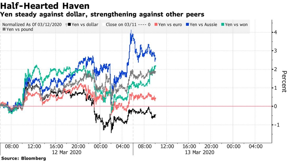 Dịch bệnh bao trùm bóng đen lên toàn cầu và với cả đồng tiền vốn được xem là tài sản an toàn bậc nhất trên thế giới. Nhà đầu tư bán các loại tài sản để thu về càng nhiều tiền mặt càng tốt. Ngân hàng trung ương Nhật Bản được dự báo sẽ nới rộng thêm các gói hỗ trợ hiện tại trong phiên họp tuần tới, nhằm kiềm chế tác động của dịch bệnh tới nền kinh tế.