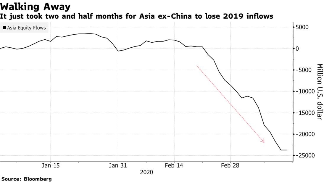 Các nhà đầu tư nước ngoài đã liên tục rút vốn ra khỏi thị trường châu Á trong tháng 2. Theo đó, dòng tiền chảy ra khỏi các thị trường lớn tại châu Á, ngoại trừ Trung Quốc, đạt 24 tỷ USD, xoá sạch số vốn mà khu vực này thu hút được trong năm 2019, theo số liệu tổng hợp của Bloomberg.