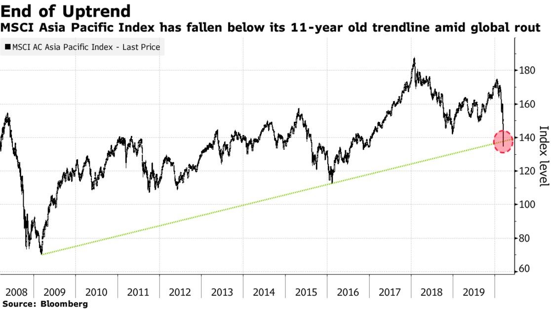 Nỗi lo sợ nền kinh tế chịu ảnh hưởng nặng nề từ dịch Covid19, bất chấp các biện pháp hỗ trợ mà nhiều chính phủ đưa ra khiến giới đầu tư đồng loạt bán tháo tại các thị trường chứng khoán châu Á. Khu vực này bước sâu hơn vào xu hướng giá xuống (bear market). Chỉ số MSCI châu Á – Thái Bình Dương giảm 6,7% trong phiên giao dịch ngày thứ 6, phá vỡ xu hướng tăng giá 11 năm qua.