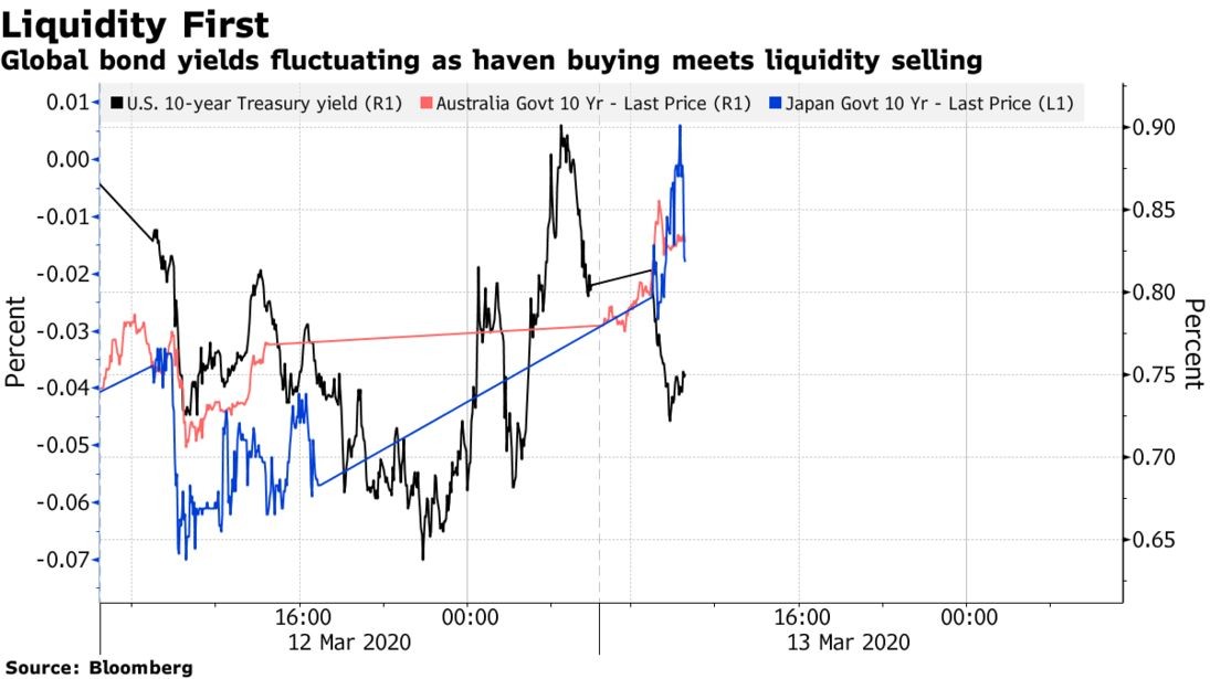 Trước đây, mỗi khi các thị trường tài chính dậy sóng, nhà đầu tư đều tìm tới trái phiếu chính phủ, xem đây là loại tài sản trú ẩn an toàn. Tuy nhiên hiện tại, “tiền mặt là vua” và ngay cả trái phiếu chính phủ cũng bị bán ra hàng loạt. Kết quả là lợi suất trái phiếu chính phủ kỳ hạn 10 năm đồng loạt leo dốc tại Nhật Bản, Australia trong phiên giao dịch ngày thứ Sáu và biến động thất thường tại các quốc gia khác.