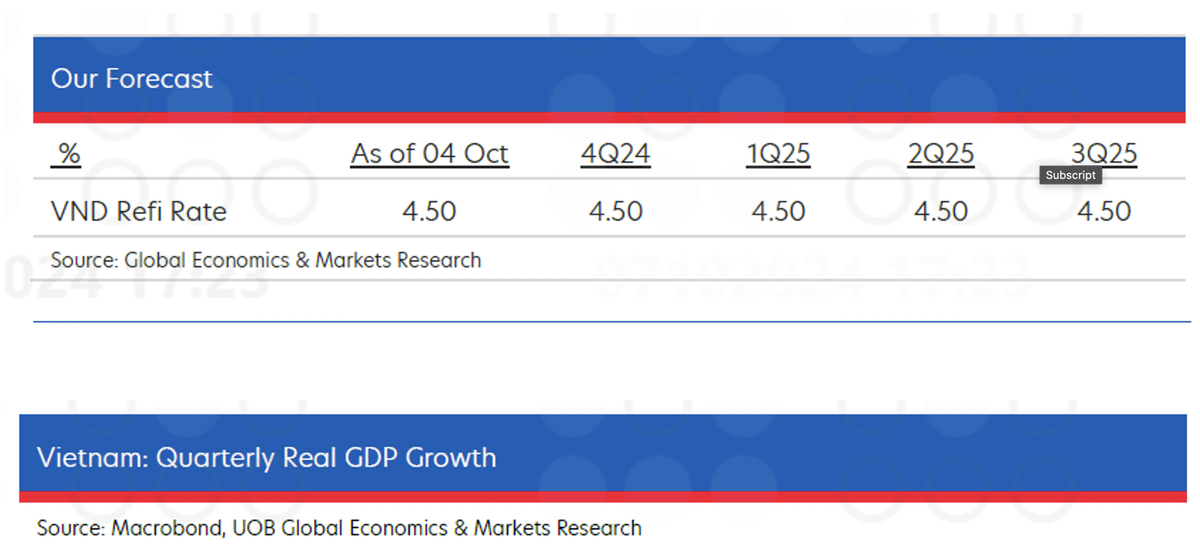 Với kết quả bất ngờ trong quý III/2024 bất chấp tác động của cơn bão Yagi, tăng trưởng GDP tới thời điểm hiện tại của năm 2024 đã đạt 6,8%. UOB đang điều chỉnh dự báo tăng trưởng cả năm của Việt Nam lên 6,4% (so với mức dự báo giảm trước đó là 5,9%) để phản ánh cả kết quả tính đến hiện tại và tính đến sự gián đoạn trong các hoạt động ở đầu quý IV/2024.