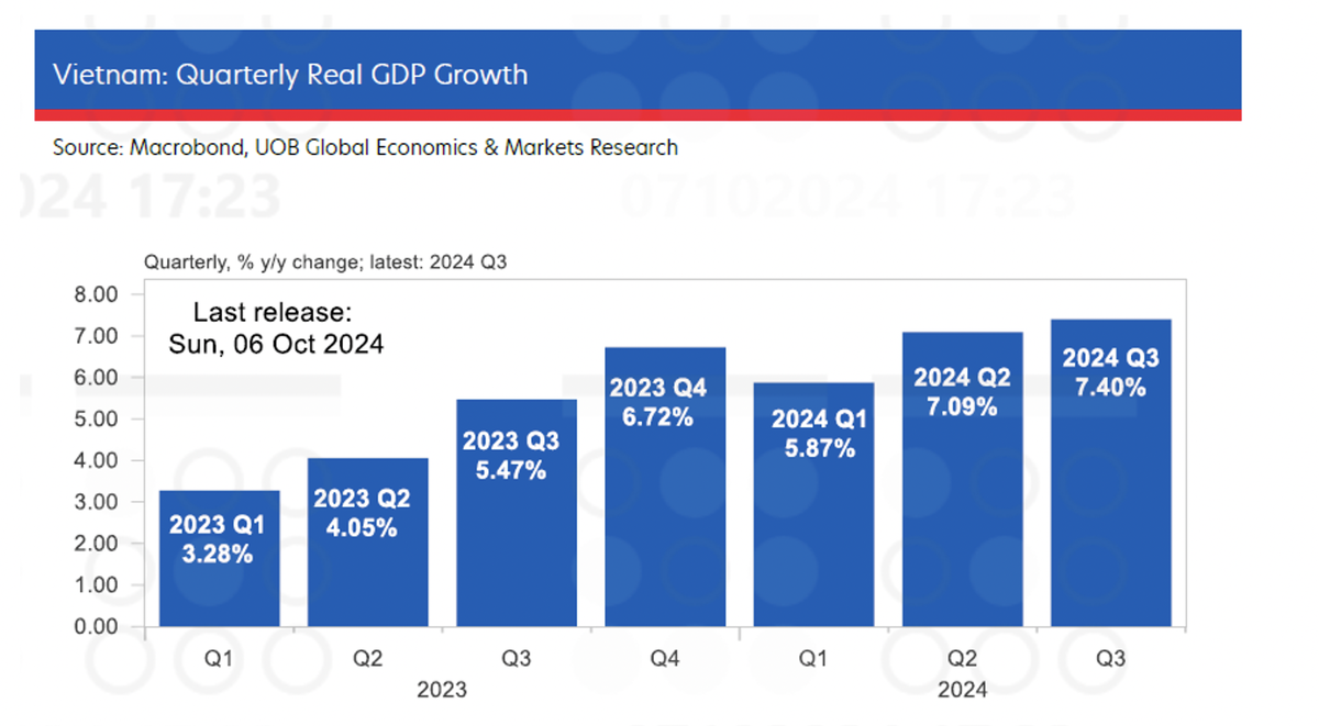 GDP của Việt Nam trong quý III/2024 tăng 7,4 % so với cùng kỳ năm trước, vượt dự báo trung bình của thị trường là 6,1% và mức dự báo của Ngân hàng UOB là 5,7%. Đây là tốc độ tăng trưởng cao nhất kể từ quý III/2022, khi các hoạt động phục hồi mạnh mẽ sau thời kỳ suy thoái do đại dịch.