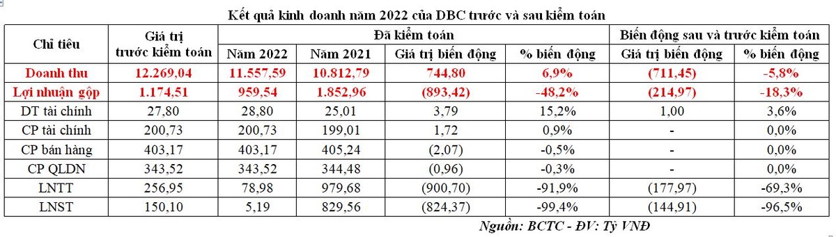 Sau kiểm toán năm 2022, Tập đoàn Dabaco Việt Nam ghi nhận doanh thu giảm 5,8% so với báo cáo tự lập, tương ứng giảm 711,45 tỷ đồng, về 11.557,59 tỷ đồng và lợi nhuận sau thuế giảm 96,5% so với báo cáo tự lập, tương ứng giảm 144,91 tỷ đồng, về chỉ còn 5,19 tỷ đồng (trước kiểm toán lãi 150,1 tỷ đồng).