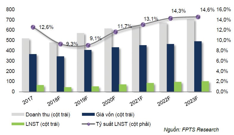Khi nhà máy Long An vận hành ổn định, dự kiến, Nafoods sẽ thay đổi được cơ cấu nguồn vốn (giảm đòn bẩy tài chính, các khoản vay phát sinh chỉ nhằm bổ sung vốn lưu động). Cùng với đó, sản lượng sản xuất tăng, giá bán nước ép chanh leo cô đặc hồi phục, FPTS dự báo CAGR doanh thu của lại sẽ vào khoảng 8%, CAGR lợi nhuận sau thuế 16,2% cho giai đoạn 2019 – 2023, tỷ suất lợi nhuận sau thuế dự kiến tăng từ 9,3% lên 13,5%.