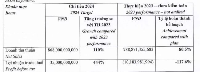 Về kế hoạch kinh doanh năm 2024, Savimex đặt mục tiêu doanh thu thuần đạt 868 tỷ đồng, tăng trưởng 110% so với thực hiện năm 2023 và lợi nhuận trước thuế đạt 35 tỷ đồng, tăng trưởng 444% so với thực hiện năm 2023.