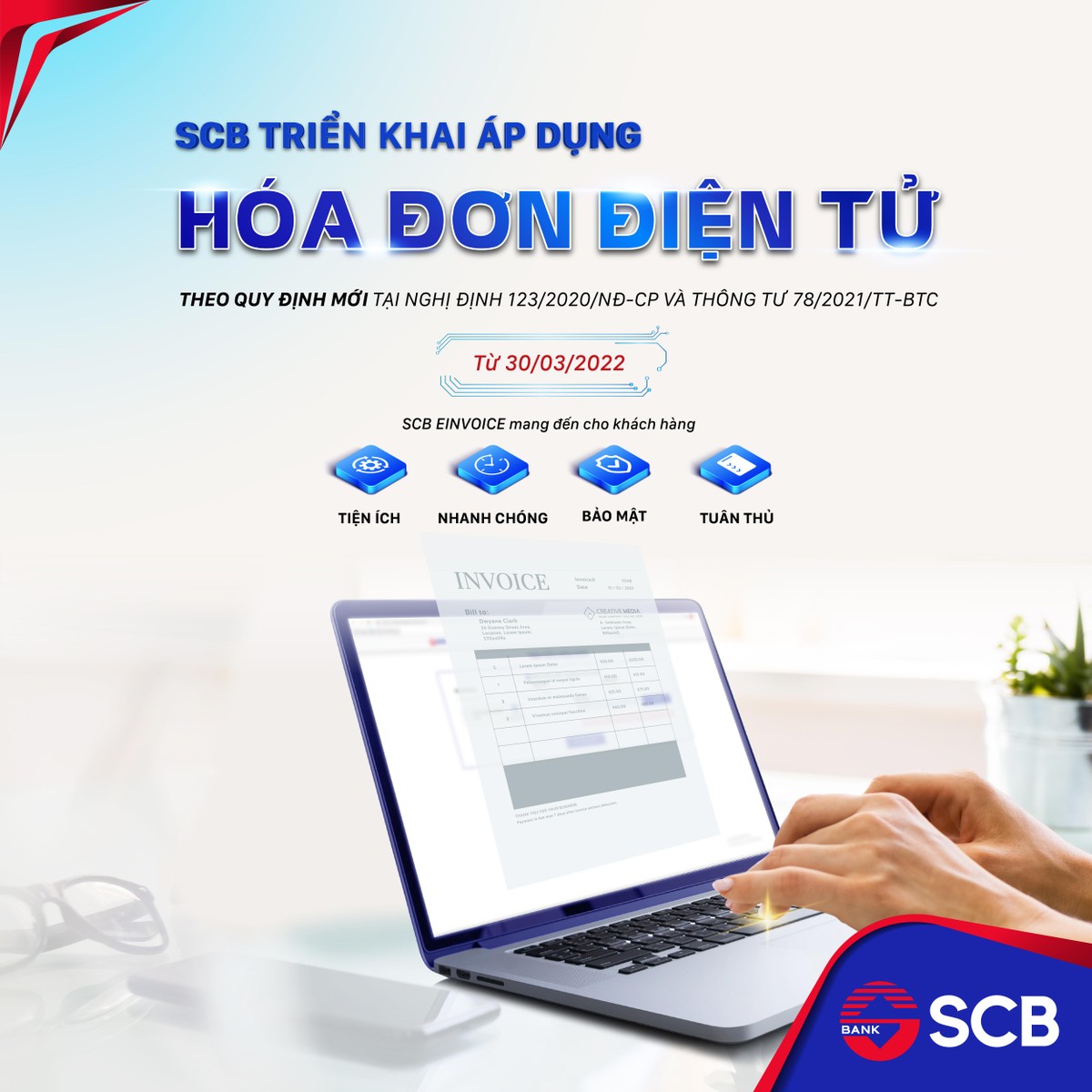 Giải pháp HĐĐT do SCB xây dựng và phát triển dựa trên nền tảng cơ sở hạ tầng công nghệ thông tin hiện đại của ngân hàng; đồng thời đảm bảo tuân thủ chặt chẽ quy định về chuẩn dữ liệu mới nhất được Tổng Cục thuế quy định tại Quyết định 1450/QĐ-TCT. Do đó, HĐĐT mà SCB mang đến cho Khách hàng sự an tâm và hài lòng vì vừa đảm bảo tính pháp lý vừa an toàn, bảo mật lại đơn giản hóa trong công tác đối chiếu số liệu, lưu trữ hóa đơn, chứng từ, góp phần giúp cho hoạt động sản xuất kinh doanh của doanh nghiệp đạt hiệu quả tối đa.