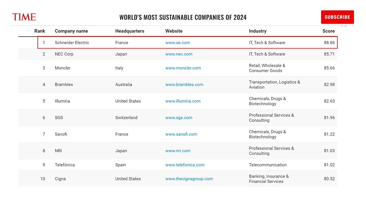 Chia sẻ về Schneider Electric, Tạp chí TIME và Statista nhấn mạnh tính chuyên môn cao về công nghệ của tập đoàn và chương trình Tác động Bền vững Schneider - Schneider Sustainability Impact (SSI). Chương trình chuyển đổi này thúc đẩy và đo lường tiến độ của tập đoàn hướng tới các mục tiêu bền vững toàn cầu giai đoạn 2021-2025, đóng góp vào sáu cam kết dài hạn bao gồm tất cả các khía cạnh môi trường, xã hội và quản trị (ESG) cũng như mức độ trung hòa carbon vào năm 2025, thúc đẩy nỗ lực của Schneider Electric trong việc chống biến đổi khí hậu, bất bình đẳng xã hội và hiện thực hóa các cam kết địa phương.