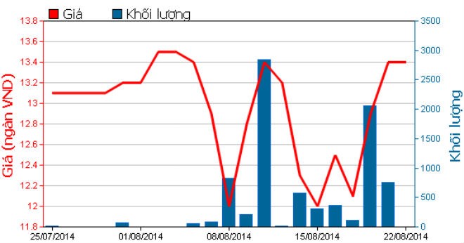 Biểu đồ giá, khối lượng giao dịch của cổ phiếu RDP trong 1 tháng qua. Nguồn: HOSE
