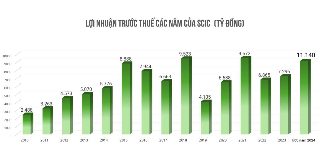 Số liệu báo cáo tổng kết của SCIC cho thấy, năm 2024 SCIC đã đạt được những kết quả kinh doanh nổi bật. Theo đó, lợi nhuận trước thuế ước đạt 11.140 tỷ đồng, bằng 166% kế hoạch năm. Nộp ngân sách nhà nước ước đạt 11.117 tỷ đồng, bằng 167% kế hoạch năm.