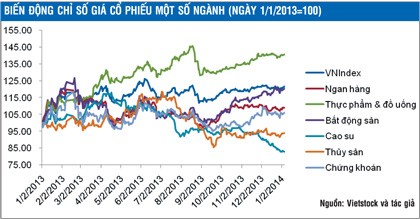 Năm 2013, các nhóm cổ phiếu thuộc ngành sản xuất thép, nhựa hóa chất và dược phẩm, vận tải, thực phẩm - đồ uống, khai khoáng đã tăng rất mạnh. Cổ phiếu của các nhóm này tăng một phần do có một số doanh nghiệp có kết quả kinh doanh khả quan. Chẳng hạn, trong ngành thép, Hoa Sen (HSG) và Hòa Phát (HPG) đều có lợi nhuận tăng rất mạnh, kéo theo cổ phiếu tăng giá. Tương tự, trong ngành dược có Dược Hậu Giang (DHG); ngành hóa chất có Điện đạm Dầu khí (DPM)…, ngành thực phẩm có Masan (MSN); ngành đồ uống có Vinamilk (VNM) là những doanh nghiệp có kết quả kinh doanh rất tốt.