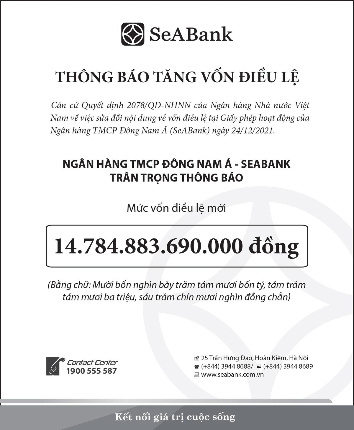 SeABank thông báo tăng vốn điều lệ