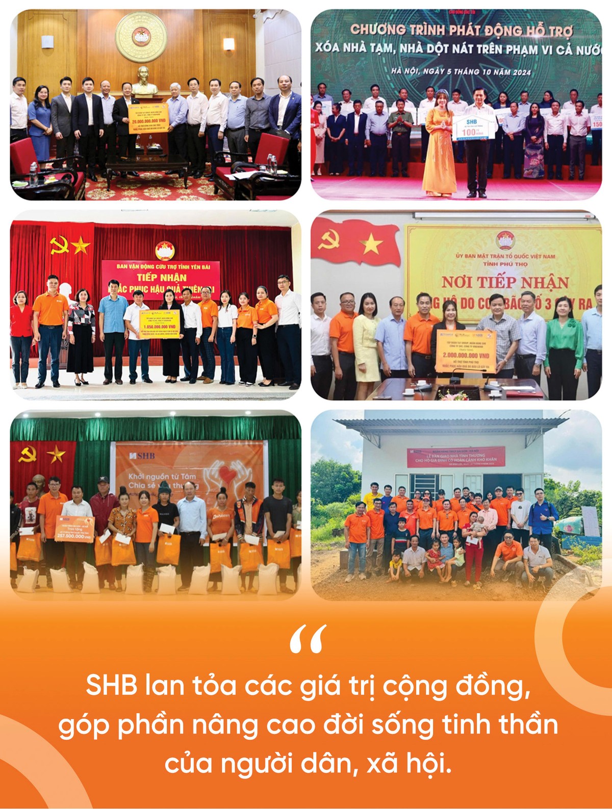 - Đóng góp cho tích cực cho các chương trình an sinh xã hội: SHB luôn là một trong những doanh nghiệp có nhiều đóng góp tích cực cho các chương trình an sinh xã hội, xóa đói giảm nghèo. Trong những năm qua, SHB đã đóng góp để xây dựng hàng nghìn ngôi nhà dành cho đối tượng là người có công với cách mạng, hộ gia đình chính sách tại nhiều tỉnh, địa phương trên cả nước, đóng góp xây dựng cơ sở hạ tầng như đường giao thông, bệnh viện, trường học… góp phần ổn định và nâng cao chất lượng cuộc sống cho người dân tại các vùng sâu, vùng xa. Vừa qua, hưởng ứng lời kêu gọi của Chính phủ, SHB đã đóng góp 100 tỷ đồng tại chương trình phát động ủng hộ xóa nhà tạm, nhà dột nát cho hộ nghèo, hộ cận nghèo trên phạm vi toàn quốc với chủ đề “Mái ấm cho đồng bào tôi”.