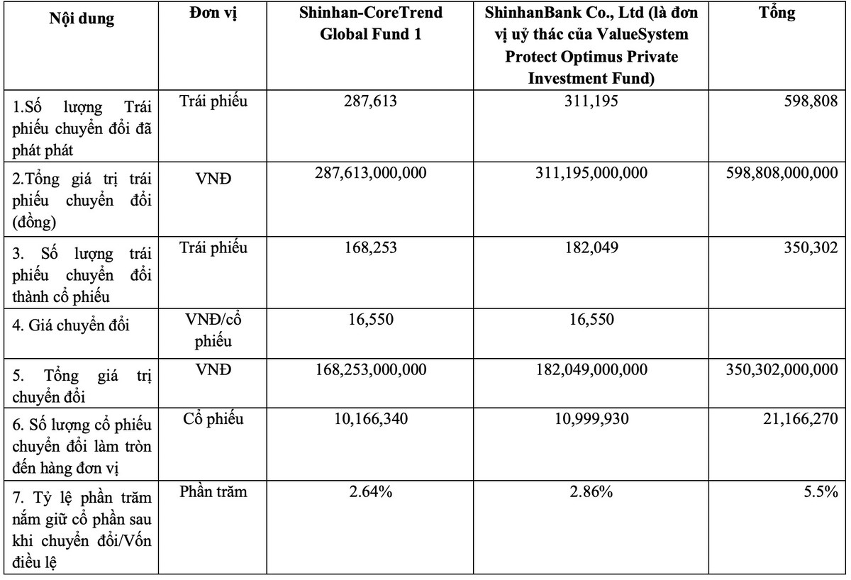 Công ty cho biết đã nhận được đề nghị chuyển đổi 350.302 trái phiếu thành cổ phiếu từ hai Quỹ đầu tư Hàn Quốc là ShinhanBank Co., Ltd (đơn vị uỷ thác của ValueSystem Protect Optimus Private Investment Fund) và Shinhan-CoreTrend Global Fund 1.