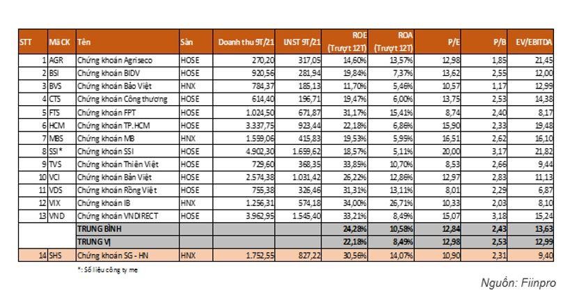 Từ bảng so sánh các doanh nghiệp trong ngành ở trên, chỉ số hiệu quả trên vốn chủ của SHS (ROE trượt 12 tháng) đạt mức 30,6% cao hơn đáng kể trung bình ngành là 24,3% trong khi đang giao dịch ở ngưỡng P/E trượt 12 tháng là 10,9 lần và P/E 2021 ở mức 9,7 lần, thấp hơn ngưỡng trung bình ngành chứng khoán là 12,8 lần. Chỉ số EV/EBITDA trượt của SHS ở ngưỡng 9,4 lần so với trung bình ngành là 13,6 lần.