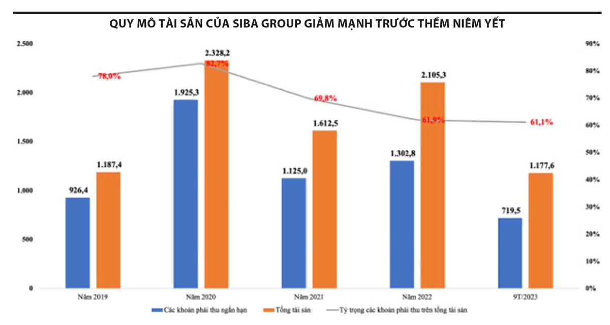 Nhìn rộng ra, quy mô tổng tài sản của Siba Group có dấu hiệu suy giảm mạnh trước thềm niêm yết. Năm 2020, tổng tài sản của Công ty là 2.328,2 tỷ đồng, nhưng tới 30/9/2023 chỉ còn 1.177,6 tỷ đồng, tương ứng giảm 1.150,6 tỷ đồng.