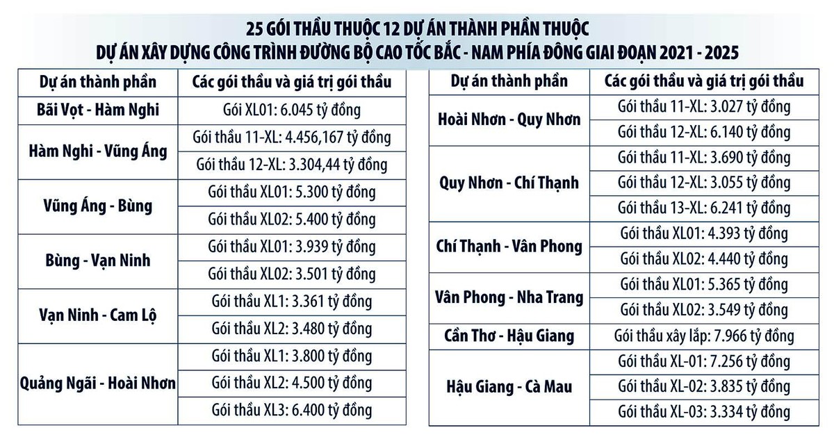 So với kế hoạch dự kiến về việc phân chia các gói thầu xây lắp được Bộ GTVT báo cáo Thủ tướng Chính phủ vào giữa tháng 9/2022, số lượng gói thầu xây lắp tại 12 dự án thành phần cao tốc Bắc - Nam phía Đông đã giảm từ 30 xuống còn 25 gói thầu. Trong số này, có 2 dự án thành phần chỉ gồm 1 gói thầu xây lắp; 3 dự án thành phần có 3 gói thầu xây lắp; 7 dự án thành phần gồm 2 gói thầu xây lắp.