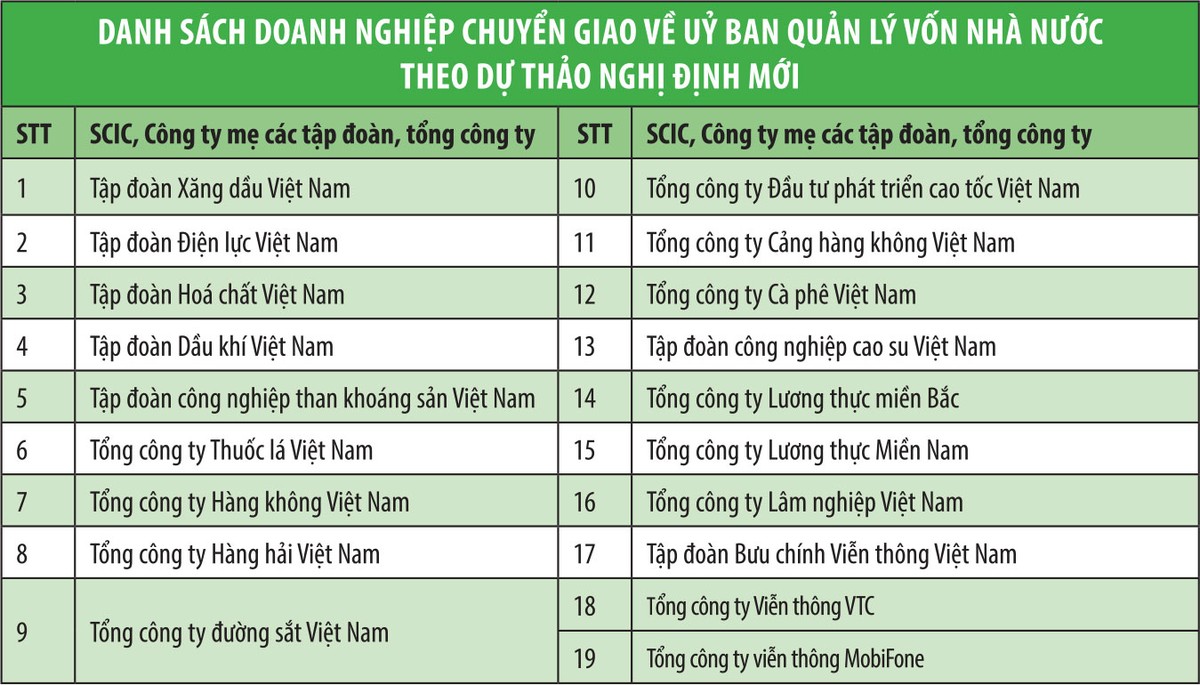 Đại diện Viện Nghiên cứu quản lý kinh tế trung ương (CIEM), cơ quan trực tiếp xây dựng và soạn thảo Nghị định cho biết, tiếp thu ý kiến thẩm định và các ý kiến đóng góp về việc cần phải làm rõ đối tượng quản lý của Ủy ban, Điều 1 của dự thảo Nghị định mới nhất đã bổ sung quy định về danh sách doanh nghiệp giao Ủy ban làm đại diện chủ sở hữu gồm 20 tập đoàn, tổng công ty bao gồm Tổng công ty Đầu tư và kinh doanh vốn Nhà nước (SCIC) và công ty mẹ của 19 tập đoàn, tổng công ty hiện đang trực thuộc quản lý của các bộ chuyên ngành.