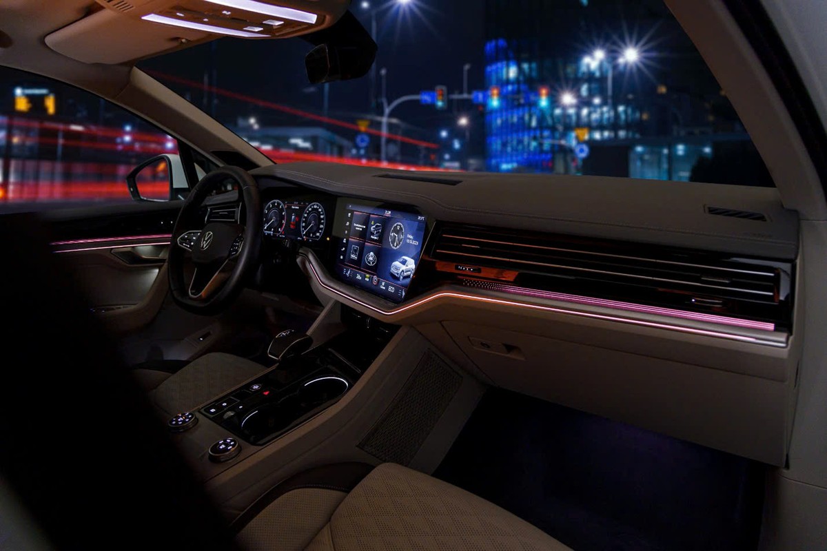 Bên trong khoang lái kỹ thuật số Innovision Cockpit của Touareg là đồng hồ tốc độ Digital Cockpit 12.3 inch và màn hình giải trí đa chức năng 15 inch, tạo nên một mặt kính lượn cong sang trọng hướng về người lái. Hệ thống âm thanh cao cấp Dynaudio 14 loa được trang bị trên bản Luxury. Tính năng cửa hít vốn thường chỉ xuất hiện trên những dòng xe sang cũng có trên Touareg.