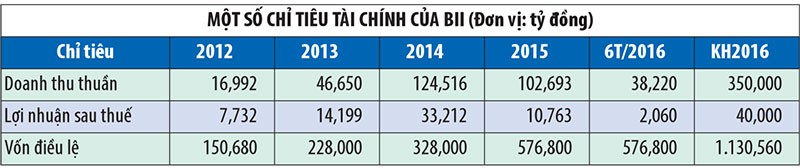 Theo báo cáo tài chính của BII, Công ty tăng vốn điều lệ từ 150,68 tỷ đồng năm 2012 lên 228 tỷ đồng năm 2013 và 328 tỷ đồng năm 2014. Năm 2015, Công ty tăng vốn lên 576,8 tỷ đồng.