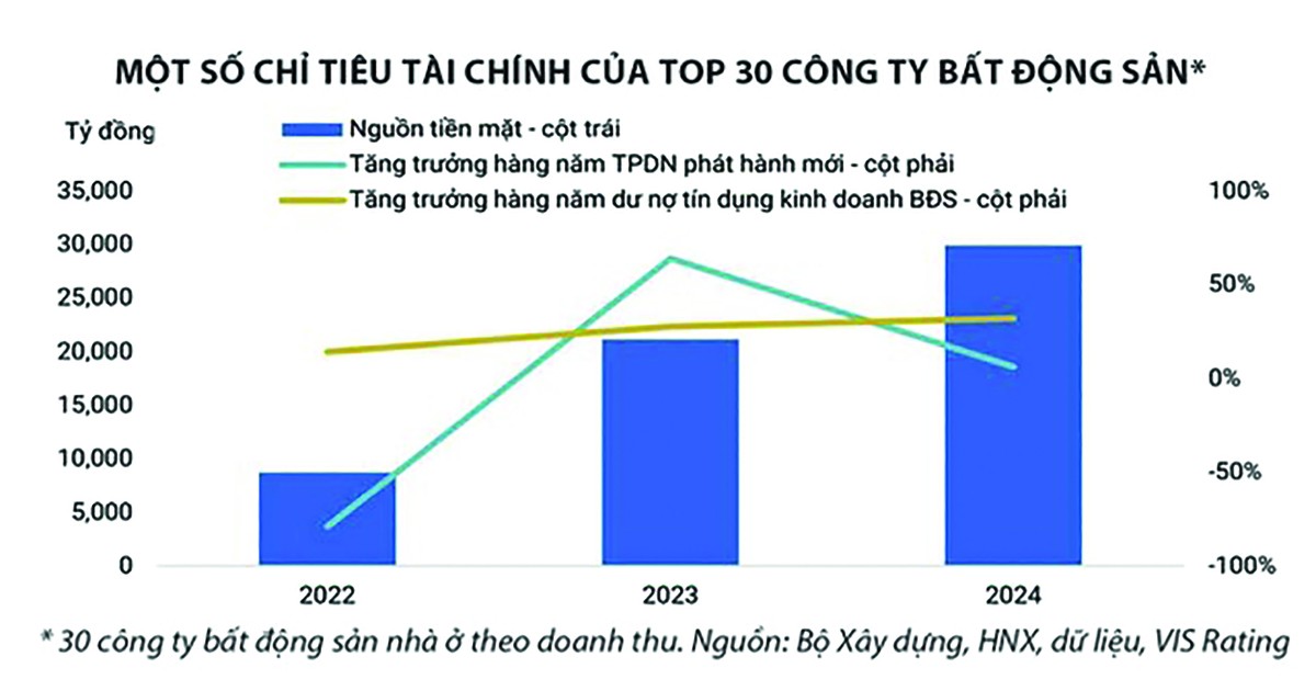 Báo cáo cập nhật kết quả kinh doanh cả năm 2024 của 30 doanh nghiệp bất động sản nhà ở niêm yết lớn nhất theo doanh thu do VIS Rating thực hiện cho thấy, nguồn tiền mặt của ngành đã tăng 46% so với cùng kỳ năm trước và đạt mức cao nhất trong 5 năm qua, nhờ vào dòng tiền mạnh mẽ từ hoạt động đầu tư và tài chính.