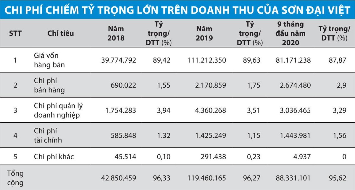 Một vấn đề đáng chú ý là chi phí chiếm tỷ trọng rất lớn trong cơ cấu doanh thu thuần của Công ty. Tổng chi phí qua các năm 2018 – 2019 và 9 tháng đầu năm 2020 đều chiếm khoảng 96% doanh thu thuần. Trong đó, tổng chi phí năm 2019 là 119,46 tỷ đồng, tăng 78,79% so với năm 2018.