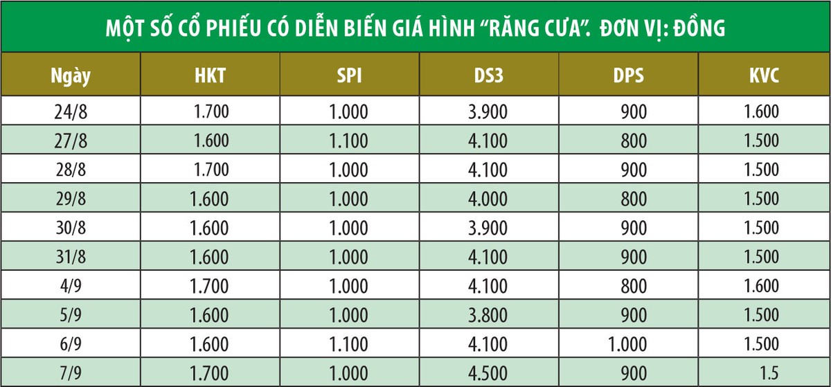 Theo anh Hà, trên thị trường có không ít mã cổ phiếu khác có diễn biến giá hình răng cưa trong vùng giá thấp và nằm trong tầm ngắm đầu tư của anh như DPS của Công ty cổ phần Đầu tư Phát triển Sóc Sơn, KVC của Công ty cổ phần Sản xuất xuất nhập khẩu Inox Kim Vĩ, ACM của Công ty cổ phần Tập đoàn Khoáng sản Á Cường, DS3 của Công ty cổ phần Quản lý đường sông số 3, HKT của Công ty cổ phần Chè Hiệp Khánh, SPI của Công ty cổ phần SPI, SBS của Công ty Chứng khoán Ngân hàng Sài Gòn Thương Tín…