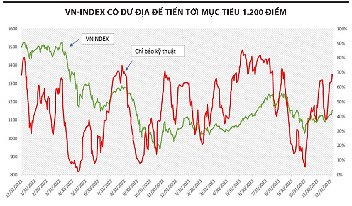Ngoài ra, thống kê tổng hợp các chỉ báo kỹ thuật cho thấy trạng thái thị trường hiện tại chưa được xem là quá “nóng”. Cụ thể, quan sát ở vùng đỉnh thị trường vào tháng 9/2023, khi chỉ báo tổng hợp vận động trên 80% trong vài tuần thì đó mới là tín hiệu cảnh báo rủi ro đảo chiều. Hiện tại, chỉ báo thị trường đang ghi nhận mức 68%, VN-Index chưa ở vùng nhạy cảm, vẫn có dư địa để tiếp tục tăng, hướng tới mục tiêu 1.200 điểm.