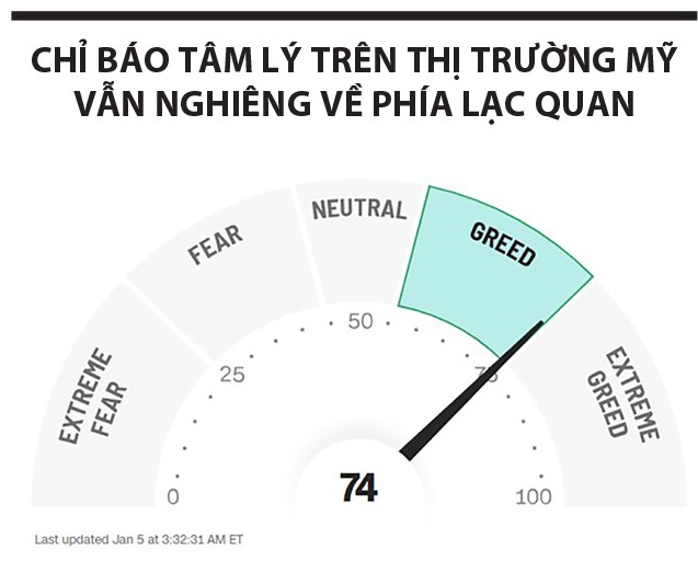 Trong khi đó, thị trường chứng khoán toàn cầu nói chung và chứng khoán Mỹ nói riêng khởi đầu những ngày đầu năm 2024 không được thuận lợi, khi hầu hết chỉ số giảm nhẹ. Tuy vậy, sau nhịp tăng mạnh mẽ vào cuối năm 2023 thì sự chững lại này cũng là điều dễ hiểu, bởi các nhà đầu tư ngắn hạn canh chốt lời chủ động, nhất là khi các chỉ báo kỹ thuật đang ở trạng thái quá mua (over-bought). Chúng tôi nhận thấy tâm lý chung của nhà đầu tư trên thị trường chứng khoán Mỹ vẫn lạc quan, chứ không quá hưng phấn để được xem là rủi ro. Điều này được thể hiện trên chỉ báo Fear & Greed Index ở mức 74/100 điểm.