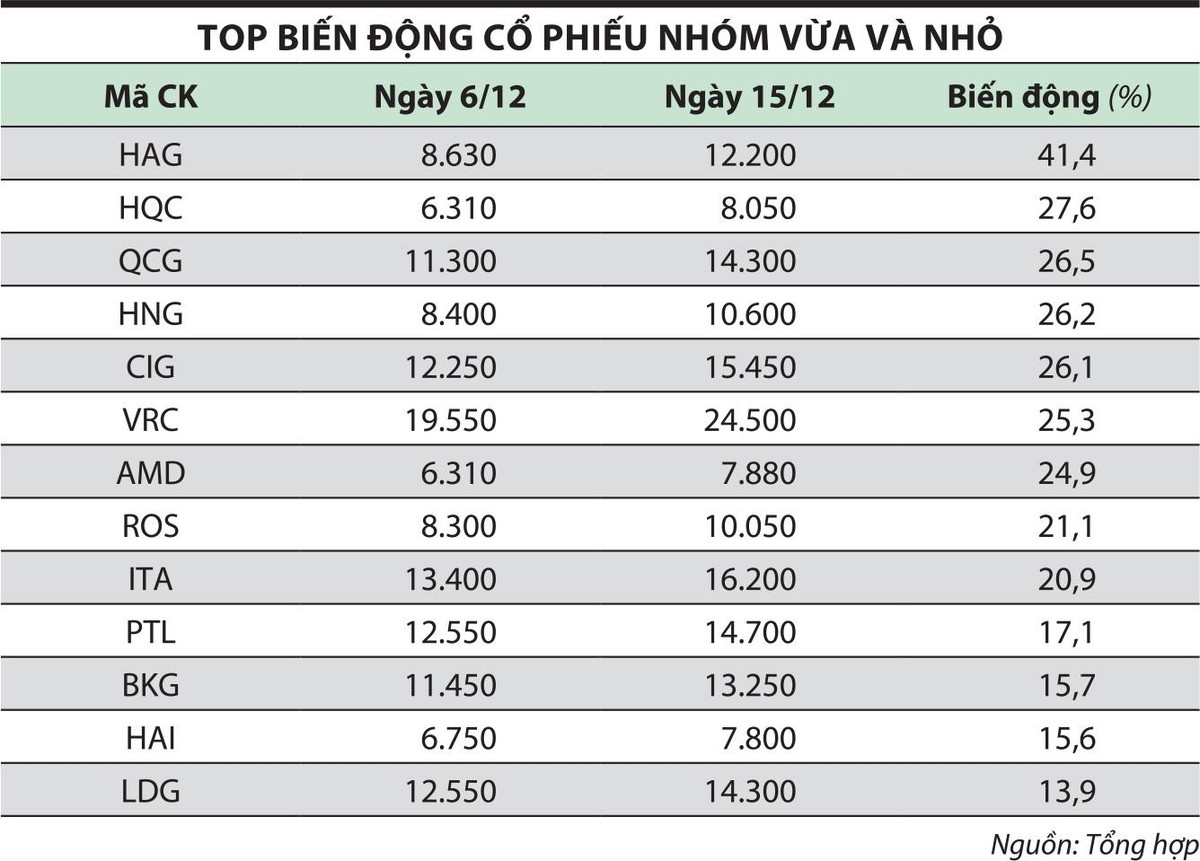 Tính từ ngày 6/12 đến ngày 15/12, chỉ số VN-Index tăng 4,4% lên 1.475,5 điểm, chỉ số VN30 tăng 2,6% lên 1.519,42 điểm và chỉ số VN Smallcap tăng 6,2%, lên 2.083,27 điểm.