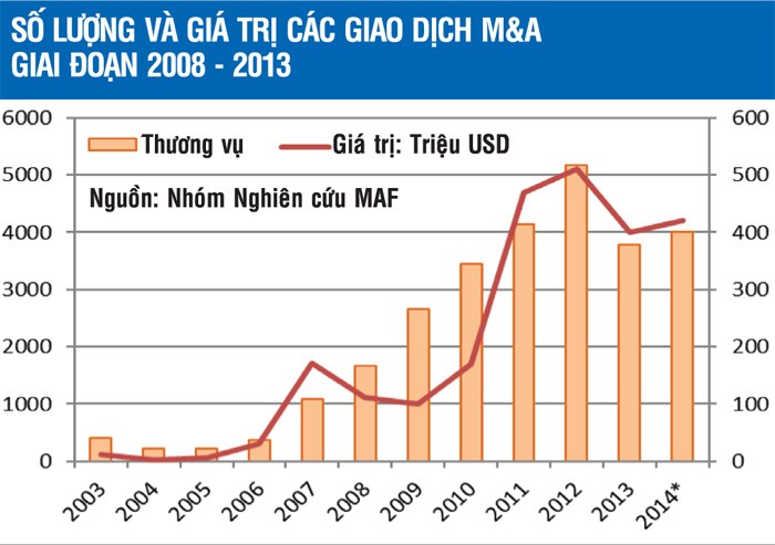 Theo Tạp chí Financial Times, giá trị của các thương vụ M&A trên toàn thế giới trong 6 tháng đầu năm 2014 đã tăng 75% so với cùng kỳ năm ngoái, chạm mốc 1.750 tỷ USD - con số cao nhất kể từ năm 2007 đến nay. Còn tại Việt Nam, năm 2009, quy mô thị trường đạt mốc 1 tỷ USD và đến năm 2012 đạt kỷ lục mới, với mức 5 tỷ USD. Thị trường M&A Việt Nam đã tiến một bước tiến dài với sự bùng phát của làn sóng thứ nhất trong giai đoạn 2009-2012.