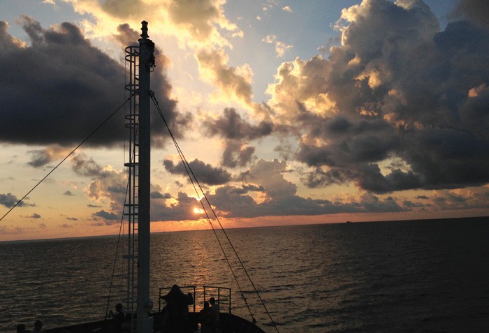 Tới hồi những con sóng lớn đã vần vò ý chí và cả thể xác con người ta ra bã rồi, tàu bắt đầu dừng lại bên một hòn đảo đẹp khác lạ có những hòn đá lớn xếp như vãi quả bàng vàng ruộm. Tắt máy, sóng lớn vẫn dữ dội. Thở phào, cuối cùng thì cũng tới, tôi nghĩ, thà kẹt ở đây còn hơn đi mãi trên biển trong cơn dông.
