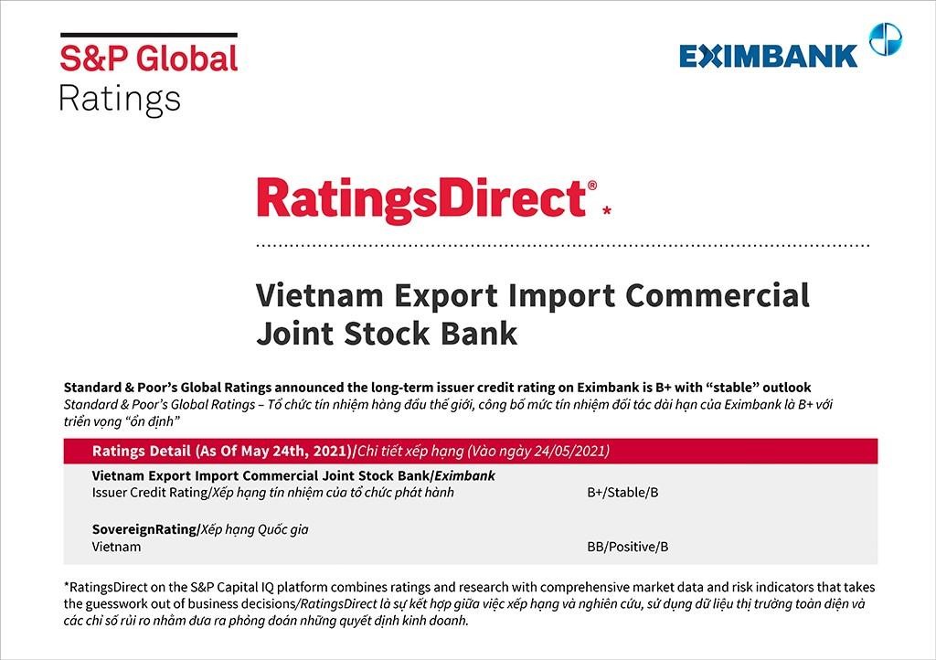 Theo đánh giá của S&P Global Ratings, thứ hạng tín nhiệm của Eximbank đã phản ánh mức suy giảm không đáng kể về chất lượng tài sản, còn huy động và nguồn vốn ổn định, dù mức tăng có hơi chững lại do ảnh hưởng của dịch COVID-19.