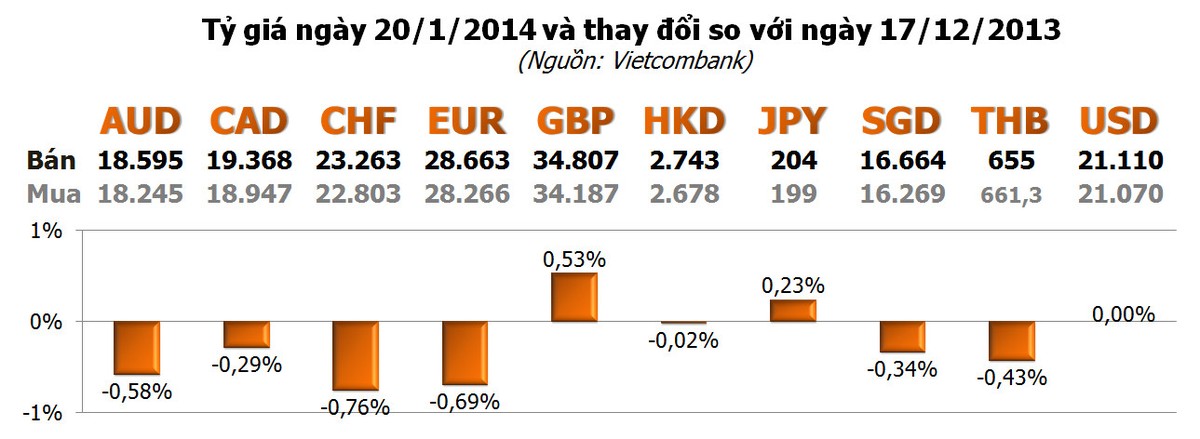 Với các ngoại tệ khác, tiếp tục chỉ có GBP và JPY tăng giá, lần lượt là 0,53% và 0,23%. Các ngoại tệ còn lại đều giảm, trong đó CHF giảm mạnh nhất với -0,76%; tiếp đến là EUR với -0,69%; AUD với -0,58%...