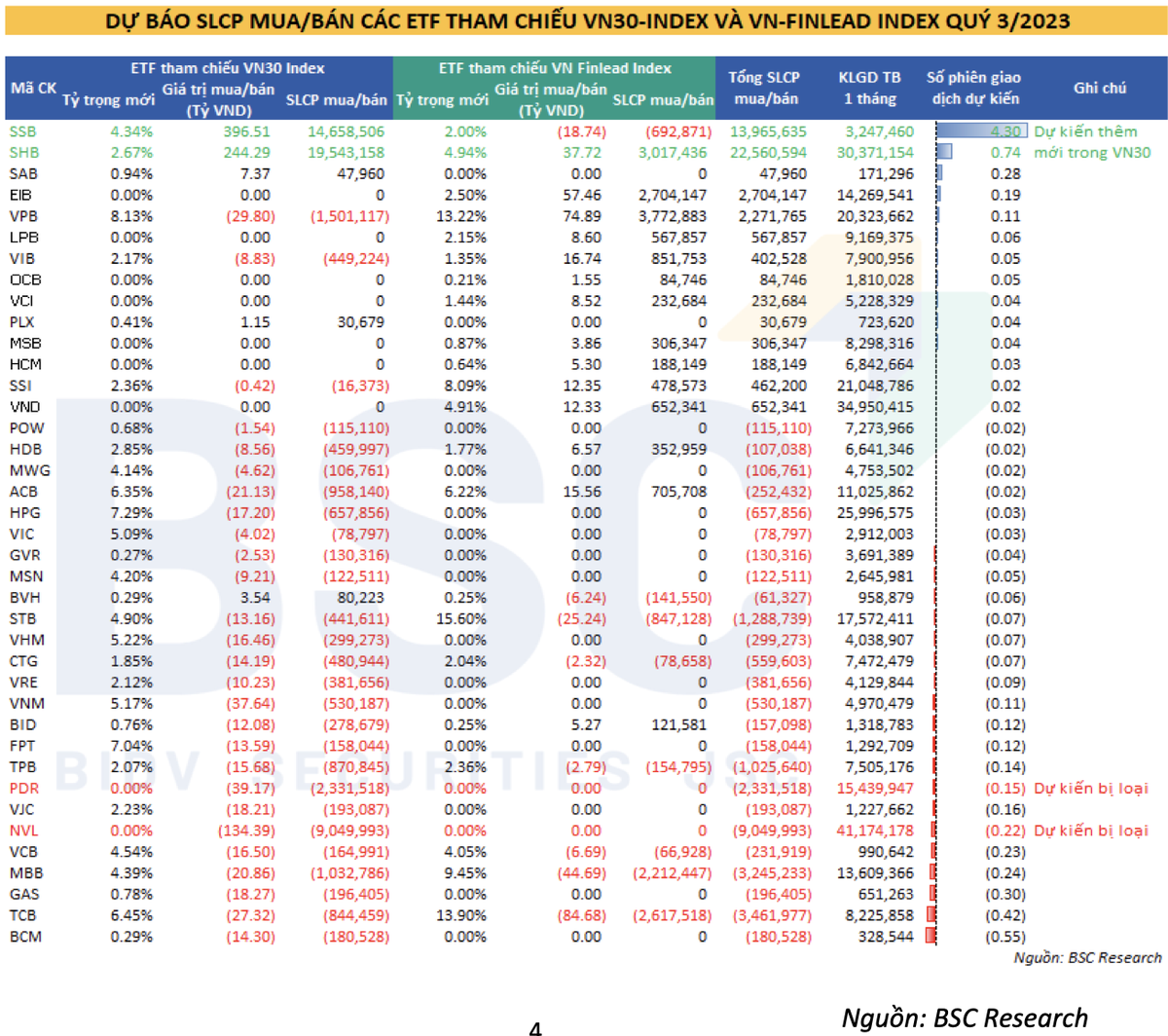 BSC dự kiến số lượng mua bán cổ phiếu tại các quỹ ETF tham chiếu theo chỉ số VN30-Index và VN-Finlead Index như sau:
