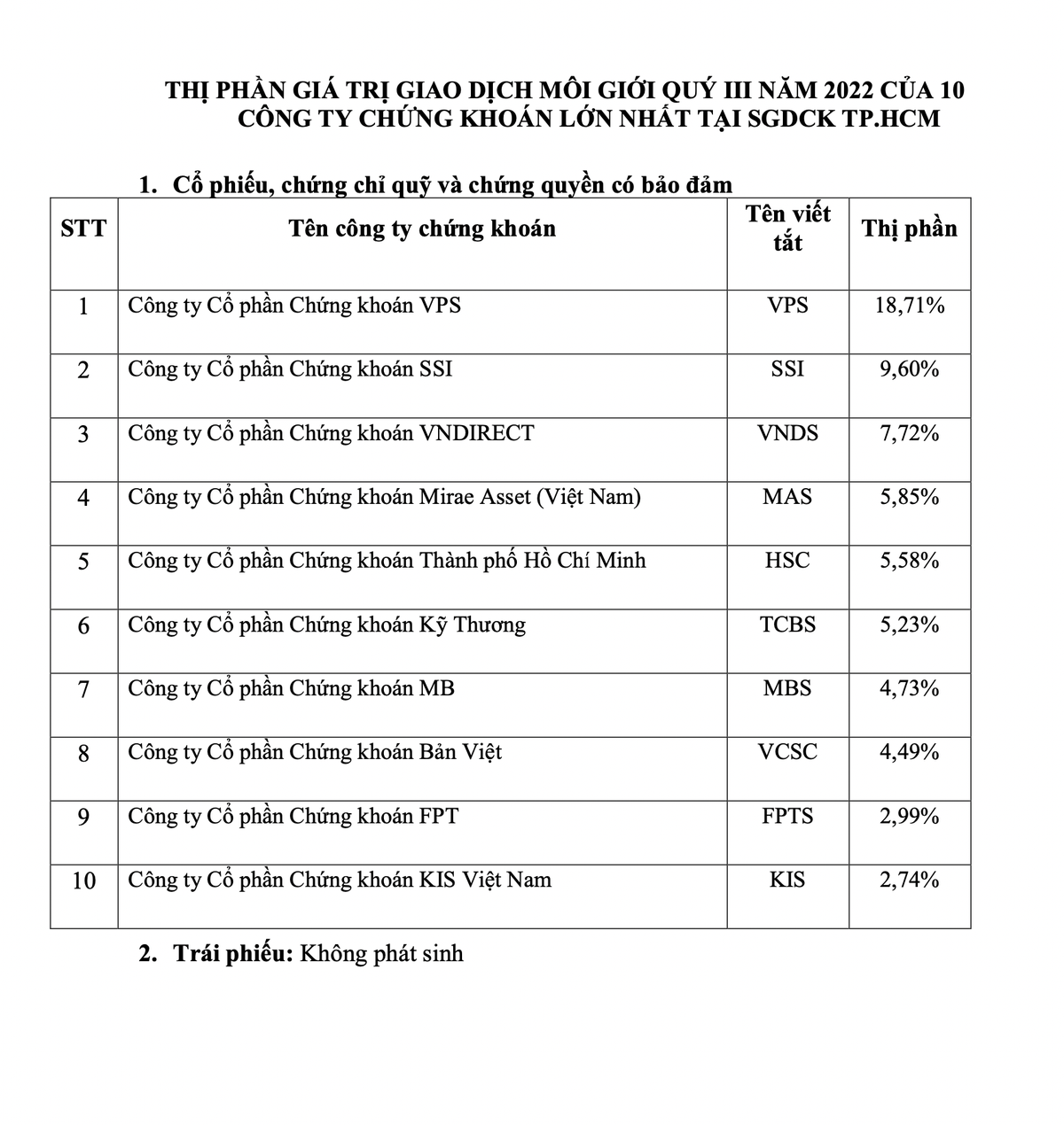 Top 10 còn lại khác gồm TCBS, MBS, VCSC, FPTS, KIS, trong đó so với quý II, MBS và VCSC đổi ngôi, FPTS và KIS đổi ngôi với nhau.