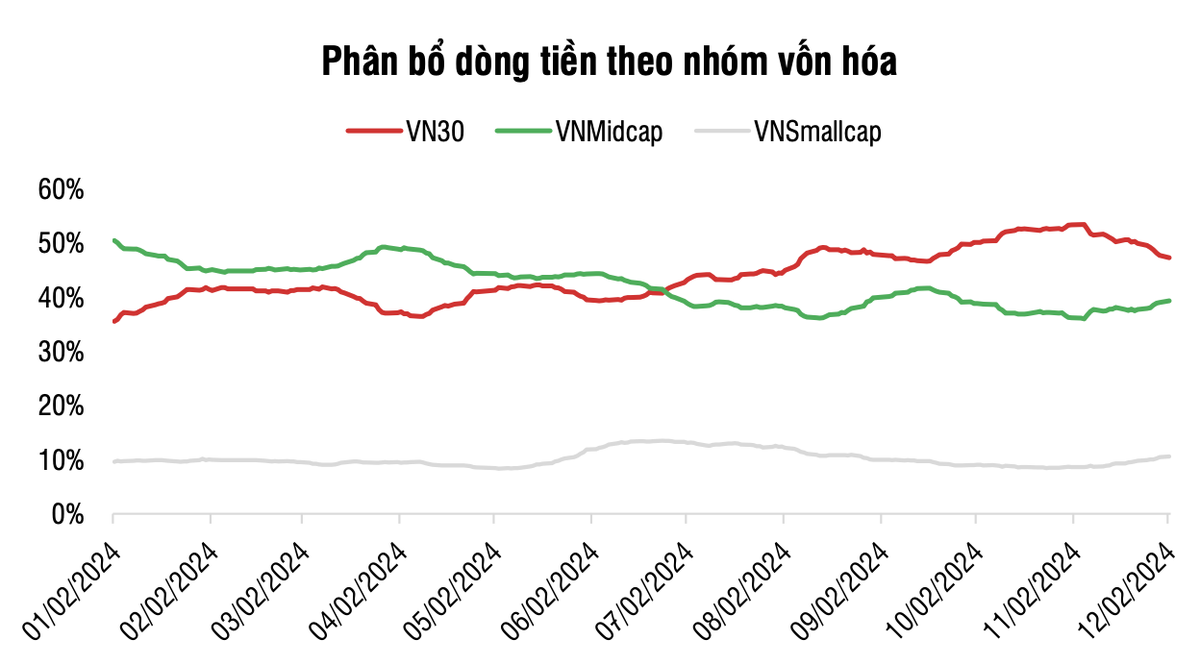 Xu hướng dòng tiền nghiêng về nhóm vốn hóa vừa và nhỏ giữa bối cảnh thanh khoản trầm lắng. Trong khi đó tỷ trọng giao dịch ở nhóm VN30 suy giảm, chủ yếu do giao dịch thu hẹp ở nhóm cổ phiếu ngân hàng.