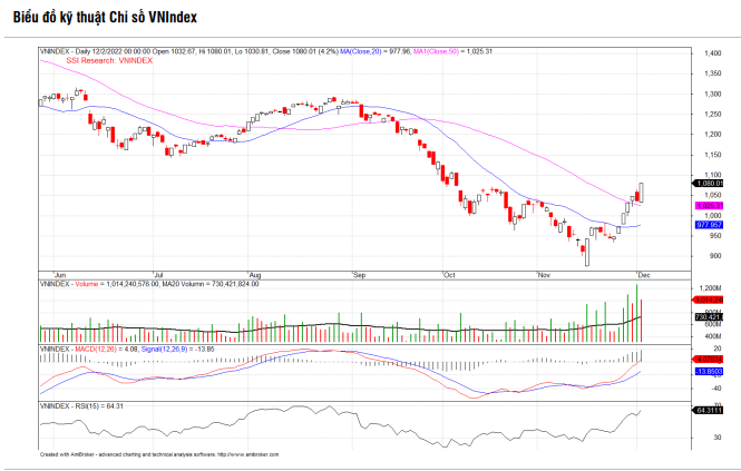 MACD trên đồ thị ngày của VN-Index sau khi hình thành trạng thái phân kỳ dương so với đường giá, hiện đã quay lại trên mức 0. Khối lượng giao dịch trên HOSE cải thiện mạnh mẽ từ nửa sau tháng 11 sau khi VN-Index quay lại với xu hướng tăng ngắn hạn.