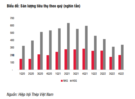 Trong khi đó, sản lượng tiêu thụ trong quý của HSG và NKG phục hồi lần lượt là 8% và 2% so với quý trước đạt 339.000 tấn và 179.000 tấn, mặc dù vẫn giảm 43% và 37% so với cùng kỳ. Điều này tương đương với công suất hoạt động khoảng 60 - 65% so với mức hơn 100% trong quý cuối cùng của năm 2021.